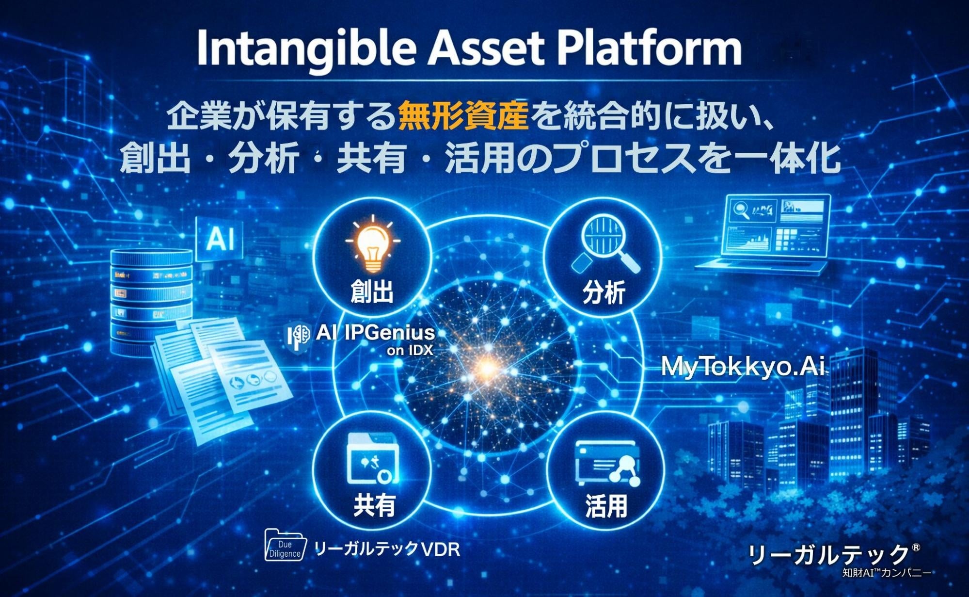 リーガルテック株式会社(東京都港区:代表取締役社長 平井 智之)は、企業が保有する発明・特許・技術文書などの無形資産を一体的に管理・活用する「Intangible Asset Platform(無形資産プラットフォーム)構想」を開始した。本構想は、発明創出プラットフォーム「IPGenius」、特許・技術分析基盤「MyTokkyo.Ai」、技術情報共有基盤「リーガルテックVDR」を統合し、無形資産の創出から活用までを一貫で支える新たな企業基盤の構築を目的とする。