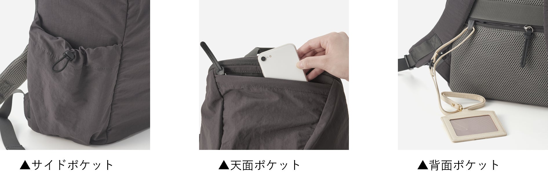 スマホや財布など、よく使うものの収納にぴったり。電車等でリュックを前持ちにしたときにも、サッと取り出しやすいのが特徴です。