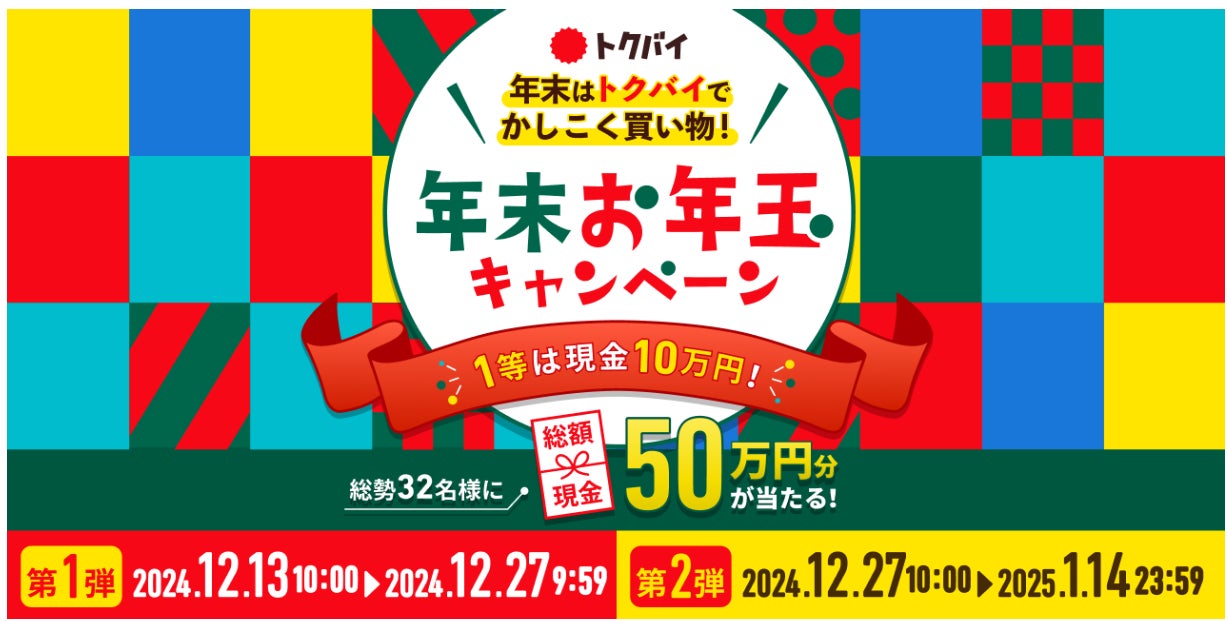 くふうカンパニーグループが運営する、チラシ・買い物情報サービス「トクバイ」は、2024年12月13日(金)から2025年1月14日(火)の期間で、年末年始の買い物を応援する「トクバイ 年末年始お年玉キャンペーン」を開催します。応募された方の中から*、抽選で合計32名様に現金10万円など「現金総額50万円」をプレゼントします。