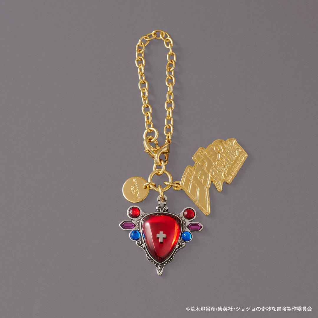 アニメ『ジョジョの奇妙な冒険 戦闘潮流』に登場するキーアイテムである「エイジャの赤石」を金具に落とし込んだバッグチャーム。