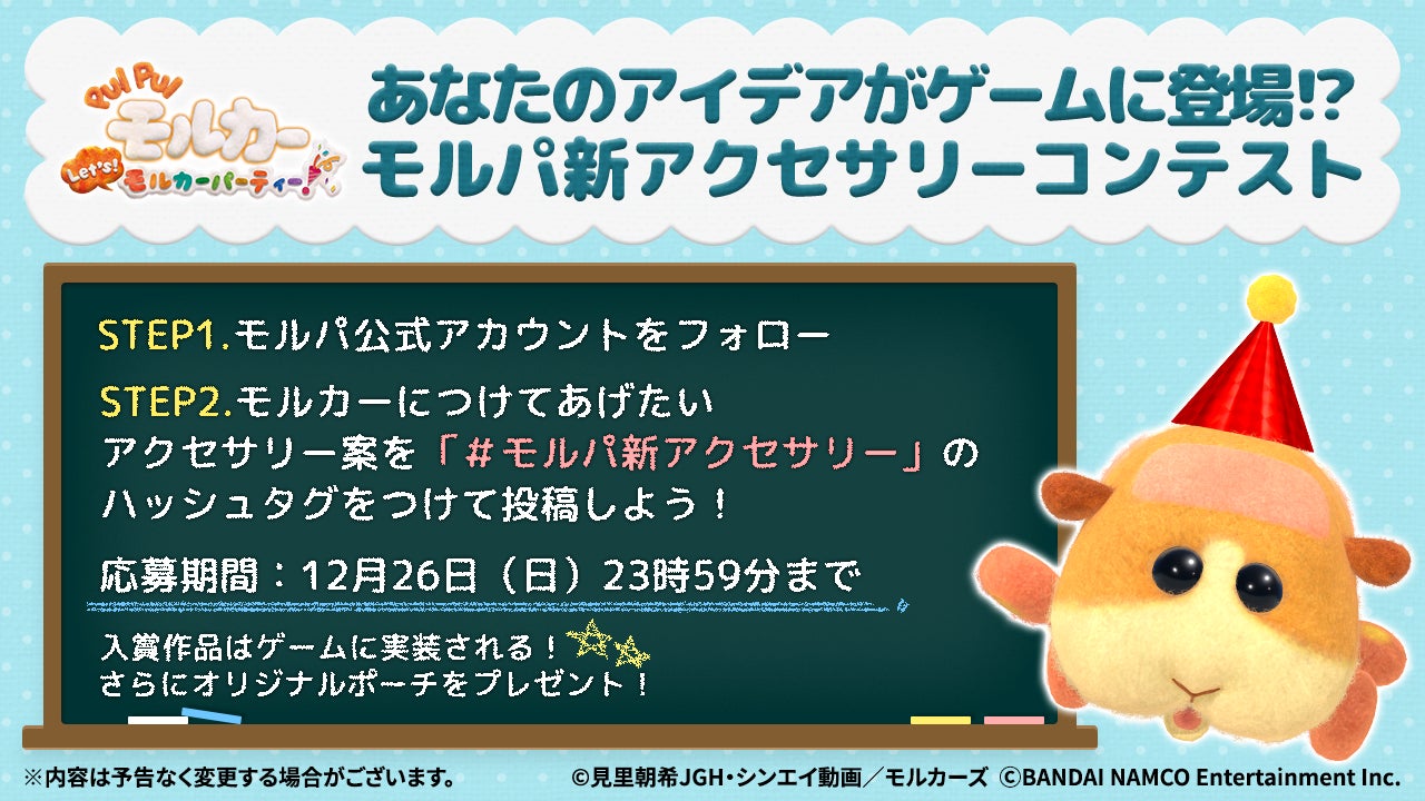 - モルカーたちにつける新しいアクセサリーを考えよう!あなたのアイデアがゲームに登場⁉モルパ新アクセサリーコンテストも開催中!