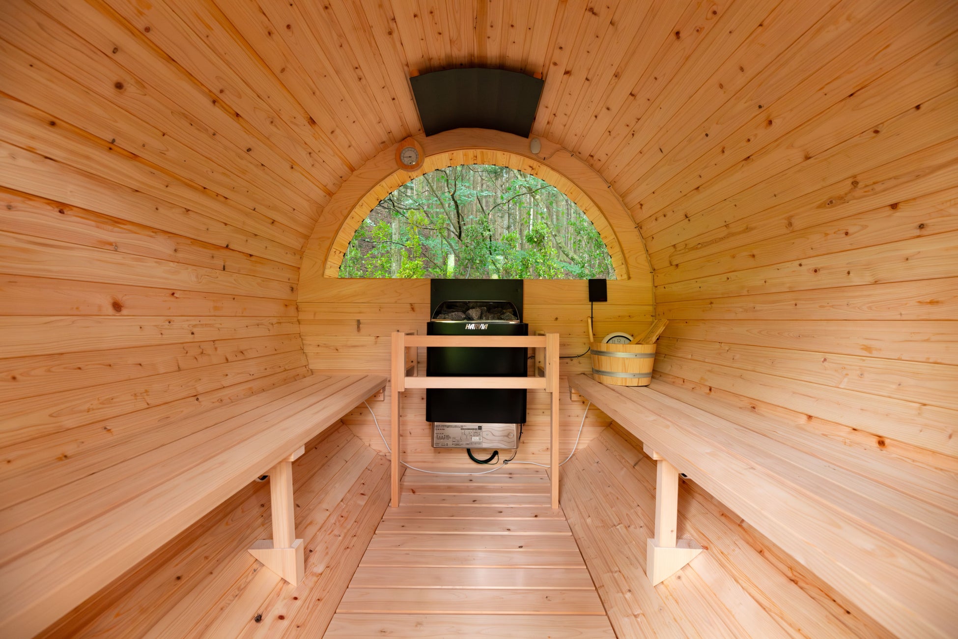 半円のクリア部分からは外の自然を望むことができ、自然と一体となりながら整うを体験していただけます。
