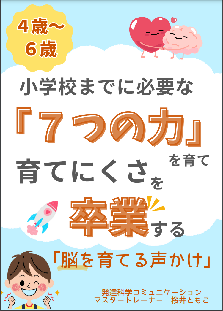 はじめまして。親子のコミュニケーションをスムーズにして子どもの発達を加速させる「発達科学コミュニケーション」講師、New mammyアカデミー主宰の桜井ともこです。幼児からの脳を育てる新しい子育ての専門家として活動しています。この度、4歳から6歳の発達が気になる子の脳タイプを知り脳の成長を加速させる小冊子、『小学校までに必要な「7つの力」を育て、育てにくさを卒業する「脳を育てる声かけ」 』無料配布開始いたしました。