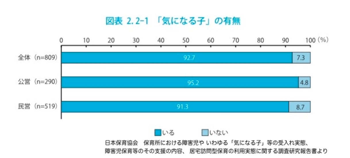 「なんだか、うちの子育てにくい」と感じる幼児をお持ちの親御さんが、発達の相談に行っても「様子を見ましょう」と言われることが多く、何の手立ても打てないまま幼児期がいたずらに過ぎてしまったという方は少なくありません。平成27年度に日本保育協会が行ったアンケートによると、保育の現場では、いわゆる「気になる子」がいると答えた保育所が9割以上(92.7%)にのぼります。