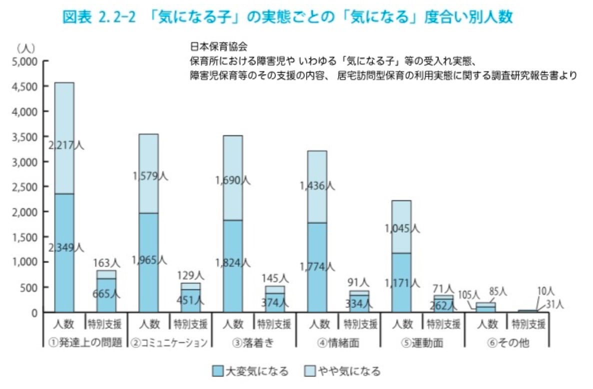 内訳を見ると、発達障害の特性と重なる点が多く見られます。例えば、「多動」「落ち着きのなさ」などは注意欠陥多動性障害に見られる特性であり、「こだわり」「集団参加への課題」などは自閉症スペクトラムに見られる特性です。保育の現場の「気になる子」の中には、発達障害が隠れているかもしれません。