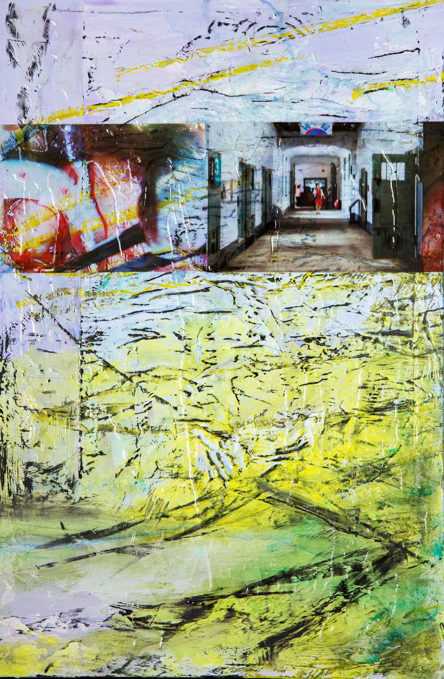 透明樹脂で作ったスクリーンが、その向こうからやってくる絵具で描いた色や形と一緒に一つのイメージを作り上げます。ピクニックというのは気軽にお出掛け、無防備に公園にリラックスしている様子を意味しますが、合わせると、楽しさと風刺の両方を込めた感じになります。最近は月に行くとか、火星に行くとか、空の向こうを想像する機会が増えつつ、NASAのクローズアップ画像が想像の余地を無くしてもいるし、一見して文章として成り立つけど、よくよく考えると矛盾が多いという状態を表現しています。(LILY NIGHT)