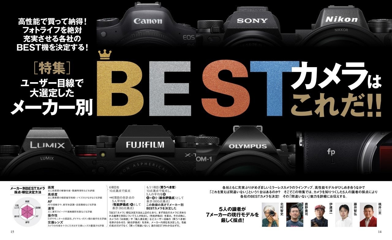 そこで本特集では、カメラを知りつくした5人の識者の採点により、各社のBESTカメラを決定します。カメラの性能評価はもちろん、お得感や購入満足度などユーザー目線の評価も加味して詳細にお伝えします。さらに、今年登場するミラーレスも大予想。注目です!