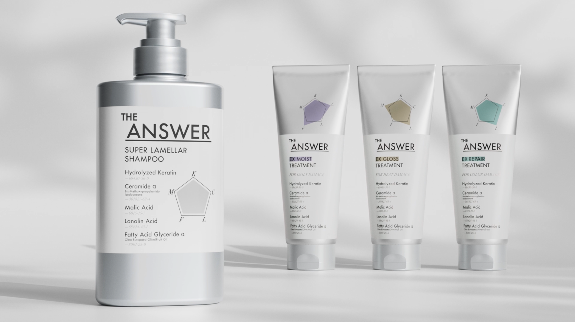 そこで花王は、100年のヘアケア研究からたどり着いた、ヘアケアの答え*⁴ として、新ヘアケアブランド「THE ANSWER」を提案します。「THE ANSWER」は、【世界初*¹】花王が考える美髪5大必須成分*²(補修)配合のシャンプー・トリートメントです。髪質問わず、うるおい、まとまり、ツヤめき、なめらかで、しなやかな髪へと導きます。