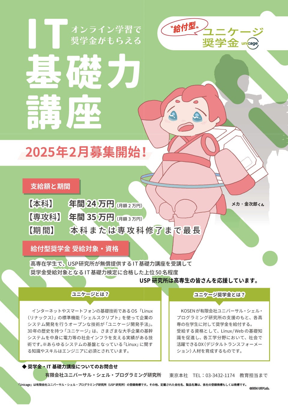 独立行政法人国立高等専門学校機構(所在地:東京都八王子市 理事長:谷口功 以下「高専機構」)は、「Unicage奨学金」の第2期奨学生を2024年12月2日に決定しました。本奨学金は、有限会社ユニバーサル・シェル・プログラミング研究所(所在地:東京都港区 代表取締役社長:當仲寛哲 以下「USP研究所」)が無償で提供する「IT基礎力講座」を受講した高専生の中で、本講座の検定試験に合格した者にのみ授与される奨学金です。
