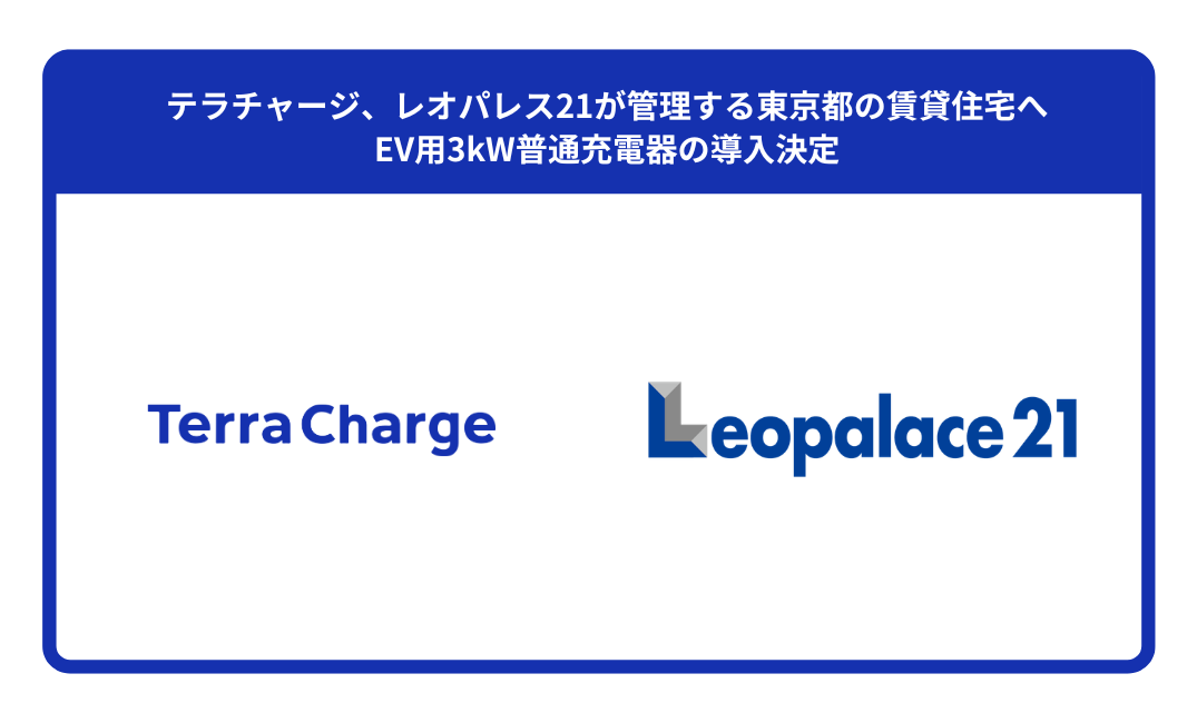 EV(電気自動車)向け充電サービス「Terra Charge(テラチャージ)」を展開するTerra Charge 株式会社(本社:東京都港区、代表取締役社長:徳重徹、以下「当社」)は、株式会社レオパレス21(本社:東京都中野区、代表取締役社長:宮尾 文也、以下「レオパレス21」)が管理する東京都の賃貸住宅の駐車場へ、3kW出力のEV用普通充電器を導入することが決定いたしました。