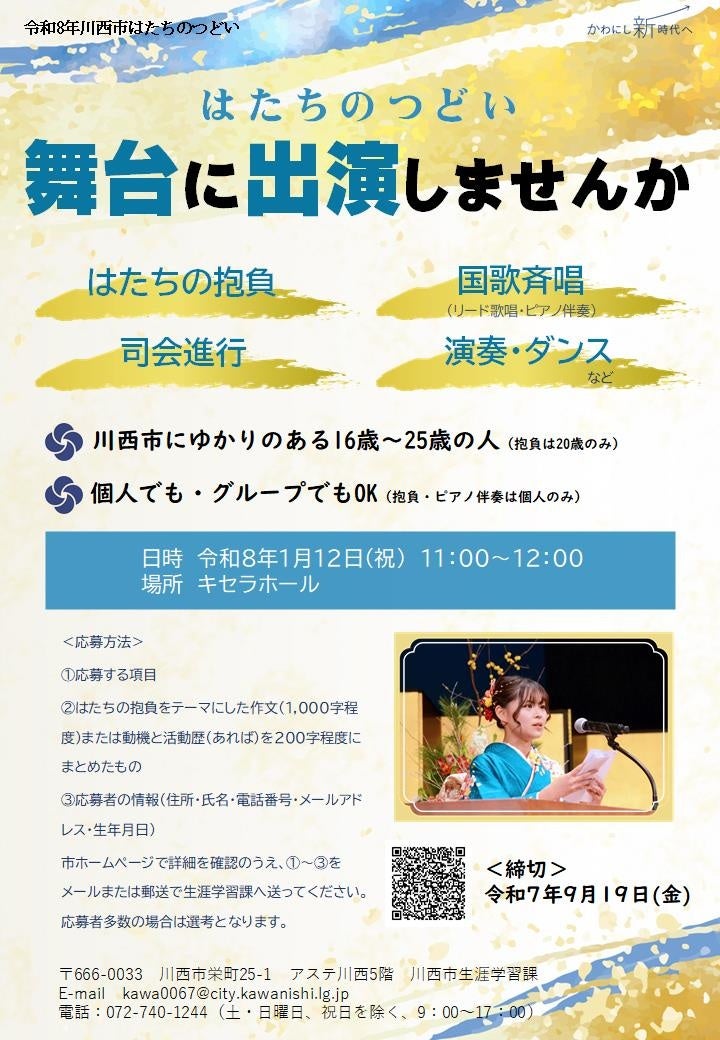 兵庫県川西市では、20歳を迎えた人が対象の式典「はたちのつどい」を今年度も令和8年1月12日(月祝)に開催。現在、はたちの抱負や自分の特技などを披露してくれる出演者を募集しています。