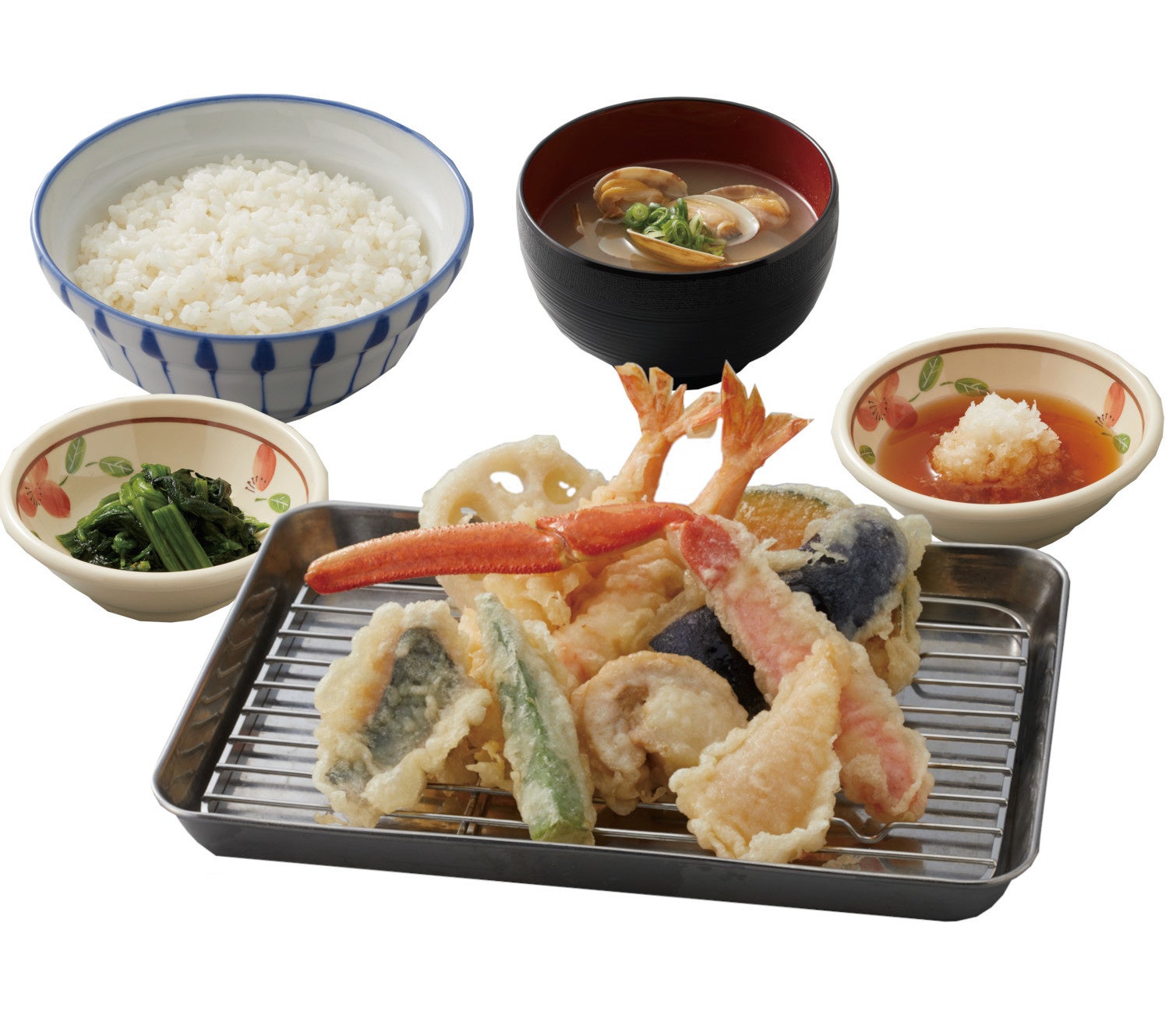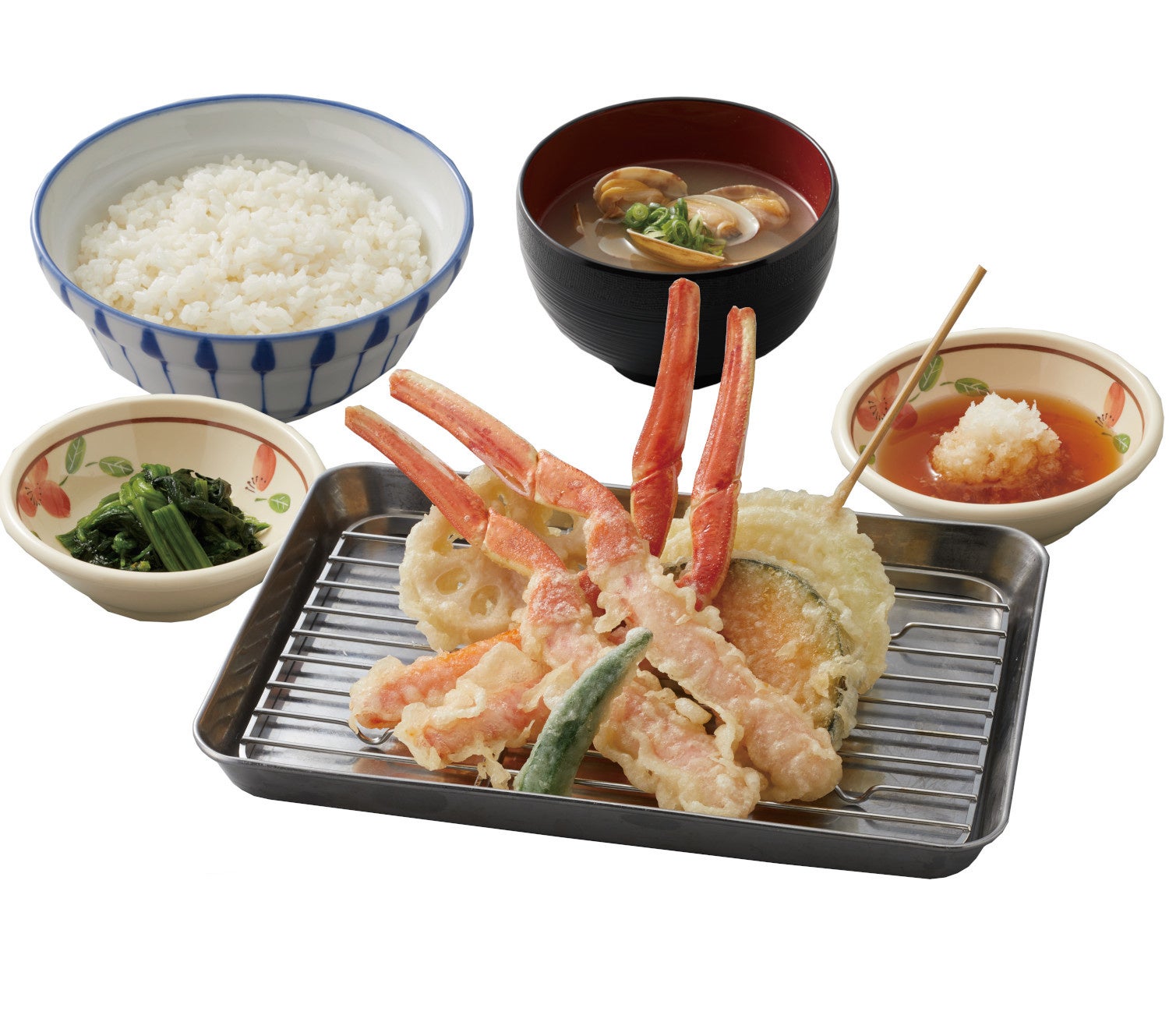 同時発売の「本ずわいがにづくし」は本ずわいがにを4本使用しており、贅沢な冬の味覚を満喫でき、天つゆでさっぱり食べる天ぷら定食もおすすめです。