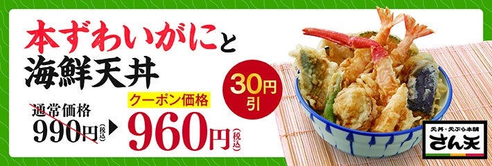 「天丼・天ぷら本舗 さん天」公式アプリでは、販売期間中に使える「本ずわいがにと海鮮天丼(定食) 30円引きクーポン」「本ずわいがにづくし天丼(定食)30円引きクーポン」を配信いたします。会員の方限定でご利用いただけるクーポンですので、この機会にぜひ「天丼・天ぷら本舗 さん天」公式アプリをダウンロード&会員登録ください。