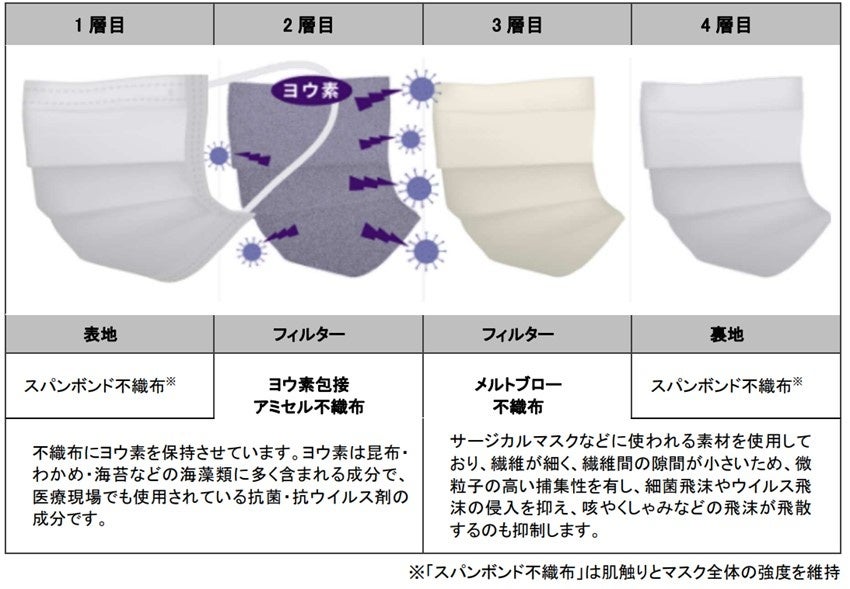 「I-53 MASK」は、元素記号が「I」、原子番号が「53」の「ヨウ素」を商品名に冠し、医療現場でも抗菌・抗ウイルスとして使われる「ヨウ素」を、不織布に保持させた機能性マスクです。マスクは 4 層で構成し、それぞれが異なる機能を持っています。