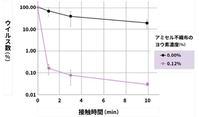 ヨウ素包接アミセル不織布にウイルスを含んだ液体を滴下し、一定時間後の生きているウイルス数を調査