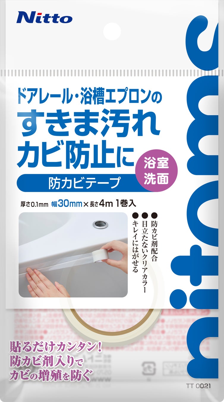 基材と粘着剤の両方に防カビ成分を配合した本製品は、浴室や洗面所など、カビの発生が気になる場所にあらかじめ貼っておくだけで、汚れやカビの発生を防ぐことができるテープです。防カビ剤のように、手袋やマスク、換気といった準備も不要なため、誰でも手軽にカビ対策が可能です。汚れが付着しにくい特殊加工を施した半透明で薄い基材を採用しており、目立ちにくく、貼っていることを意識させない自然な仕上がりで、日常の空間にもすっとなじみます。また、貼りやすく、はがす時にはのり残りしにくい粘着設計です。サイズは、幅15mmと30mmの2種類で、使いたい場所に合わせて選べます。カビが発生してから掃除するのではなく、あらかじめ防ぐ“予防清掃”の発想で、日々の家事の負担を軽減し、より快適な暮らしをサポートします。