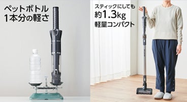 ワンタッチでハンディからスティック掃除機に早変わり。スティック掃除機も約1.3㎏なので、片手でも軽々持ち上がり、階段の登り降りもラクラクです。