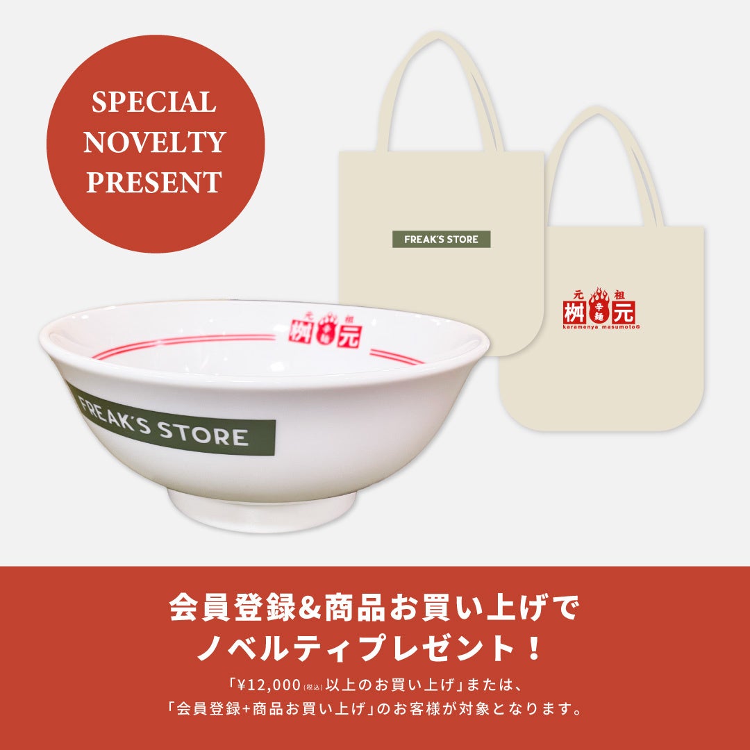 「¥12,000(税込)以上のお買い上げ+会員登録」で"「辛麺屋 桝元」のどんぶり(小)にFREAK'S STOREのロゴをプリントしたスペシャルバージョンどんぶり"、「会員登録+商品お買い上げ」の⽅に"ロゴ入りトートバッグ"をプレゼント!