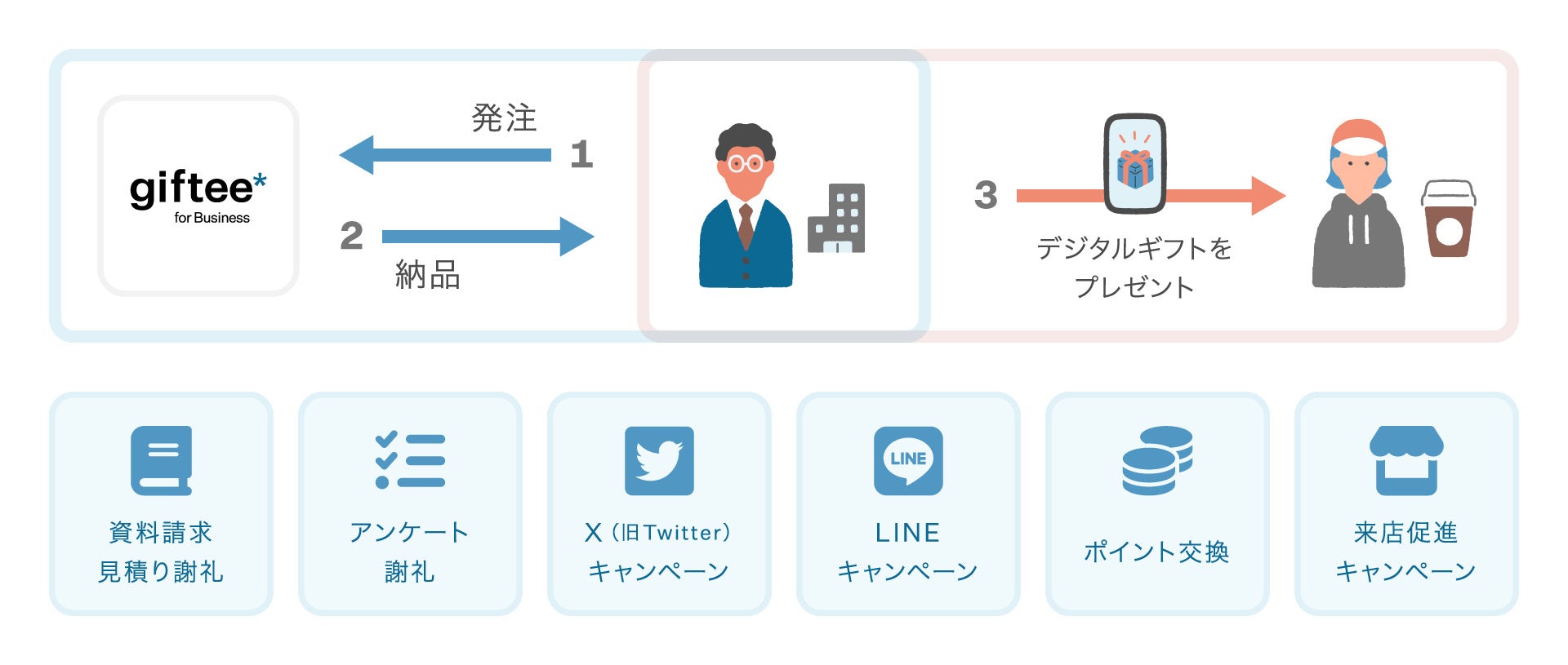 (※2) giftee for Businessとは、eギフトを活用した法人向けサービスです。キャンペーンの景品やお客様への謝礼にeギフトをご利用いただけます