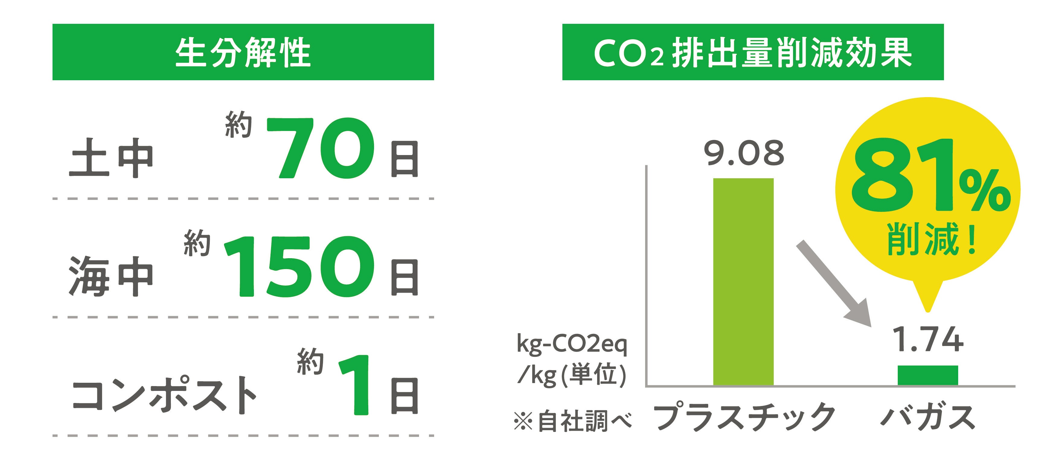 バガスシリーズは廃棄される植物の有効活用だけではなく、海や土壌、コンポストで分解する特長があるほか、プラスチックと比べ、LCA の観点から 80%以上の二酸化炭素排出量削減効果が期待できる、エコロジカルな包材です。