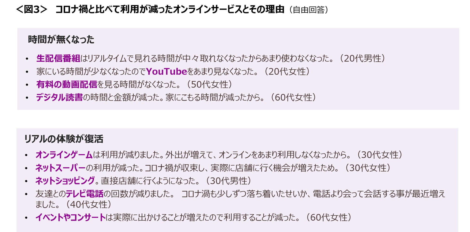 自由回答をみると、これまでオンラインで代替されていたイベントがリアルで開催されるようになったことや、外出の機会が増えて在宅時間が減ったこと、対面でのコミュニケーションが復活したことがオンラインエンタメコンテンツの利用減少の理由となっている。<図3>