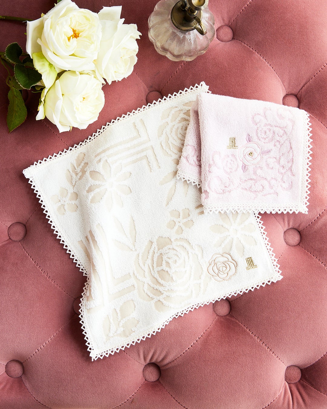 ローズをメインモチーフに、柔らかな色合いでまとめたタオルハンカチ。