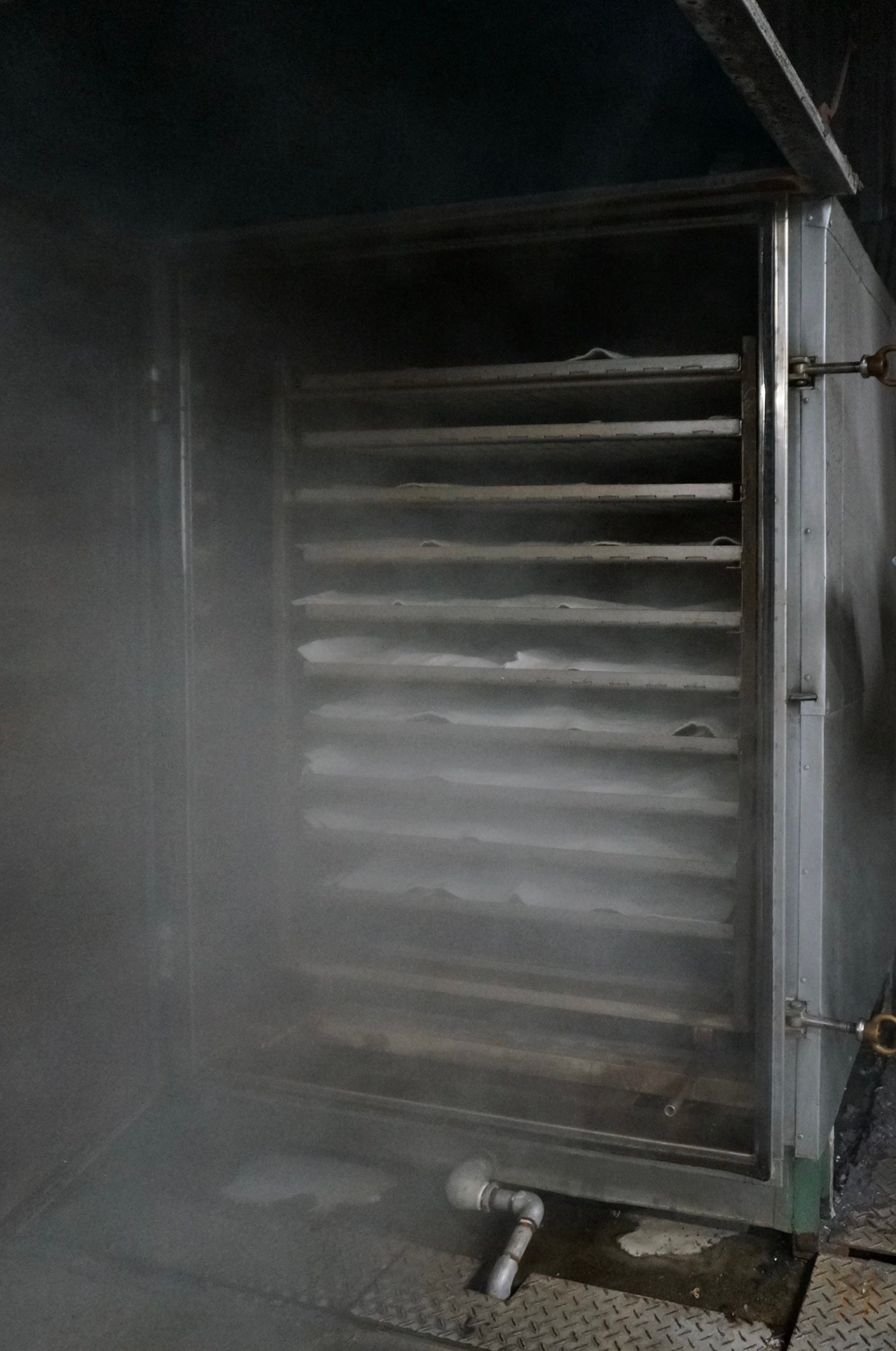 染色機から取り出した直後。色を定着させるためにスチーム機へ。蒸気で熱を加えると、色が定着します。