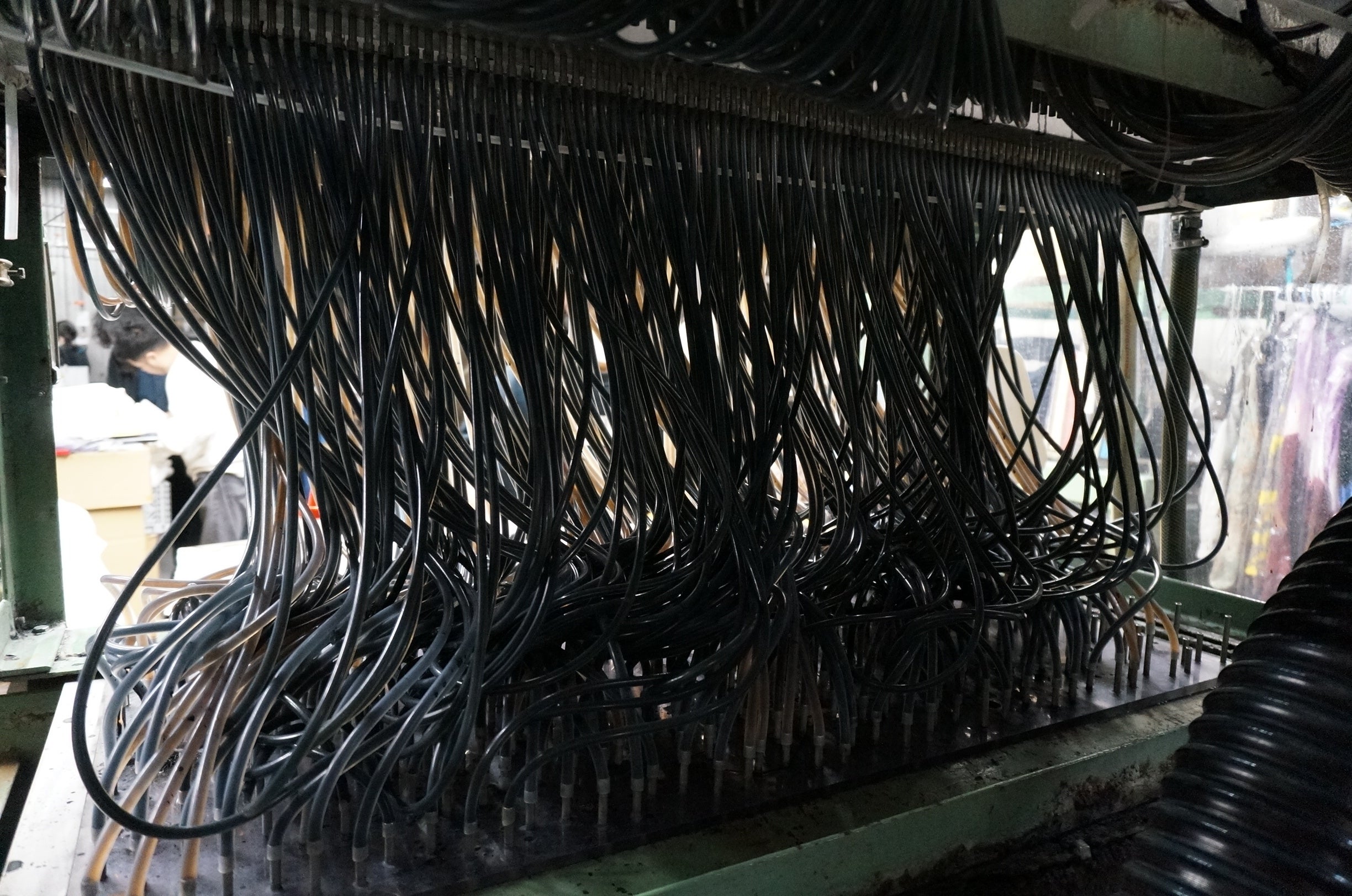 注染機には、染料を上から注ぐための無数のノズルがあり、