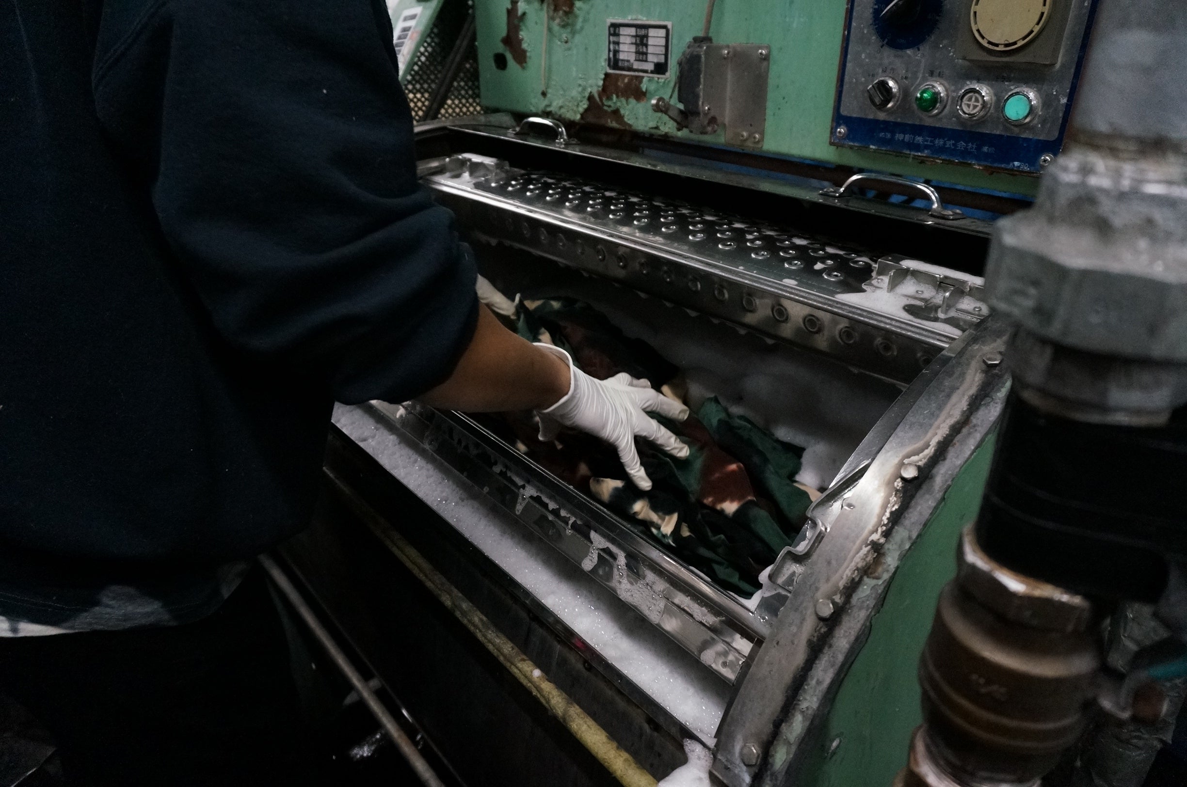 ボディにクシャッとニュアンスをつけ、染色機へ。このニュアンスの加減が仕上がりを左右するため、