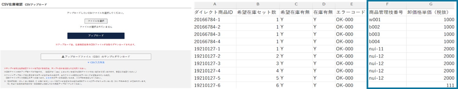 従来は「希望在庫有無」「在庫有無」「エラーコード」の情報が出力される仕様でしたが、この度の機能改善により「商品管理枝番号」と「卸価格単価」も新たに出力されるようになりました。