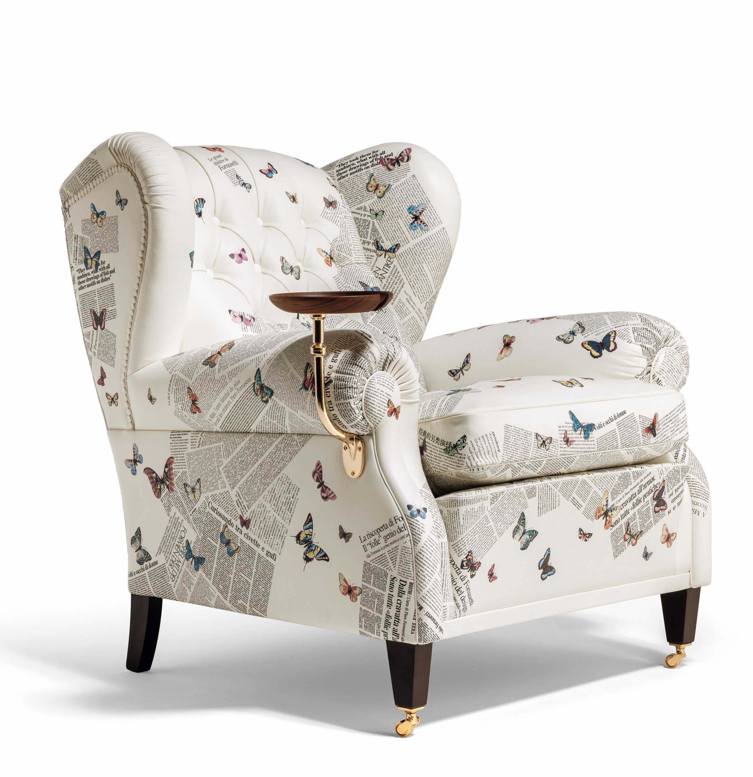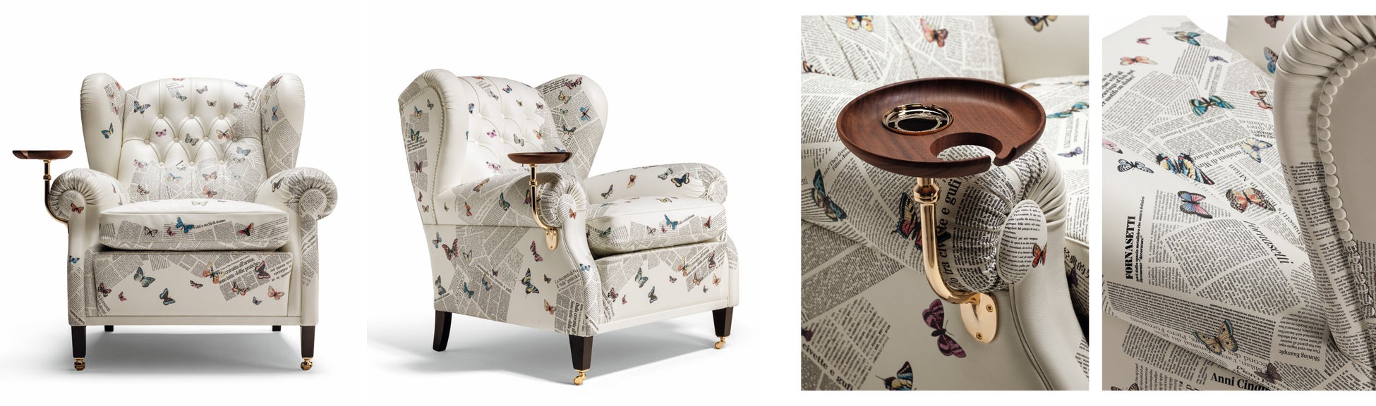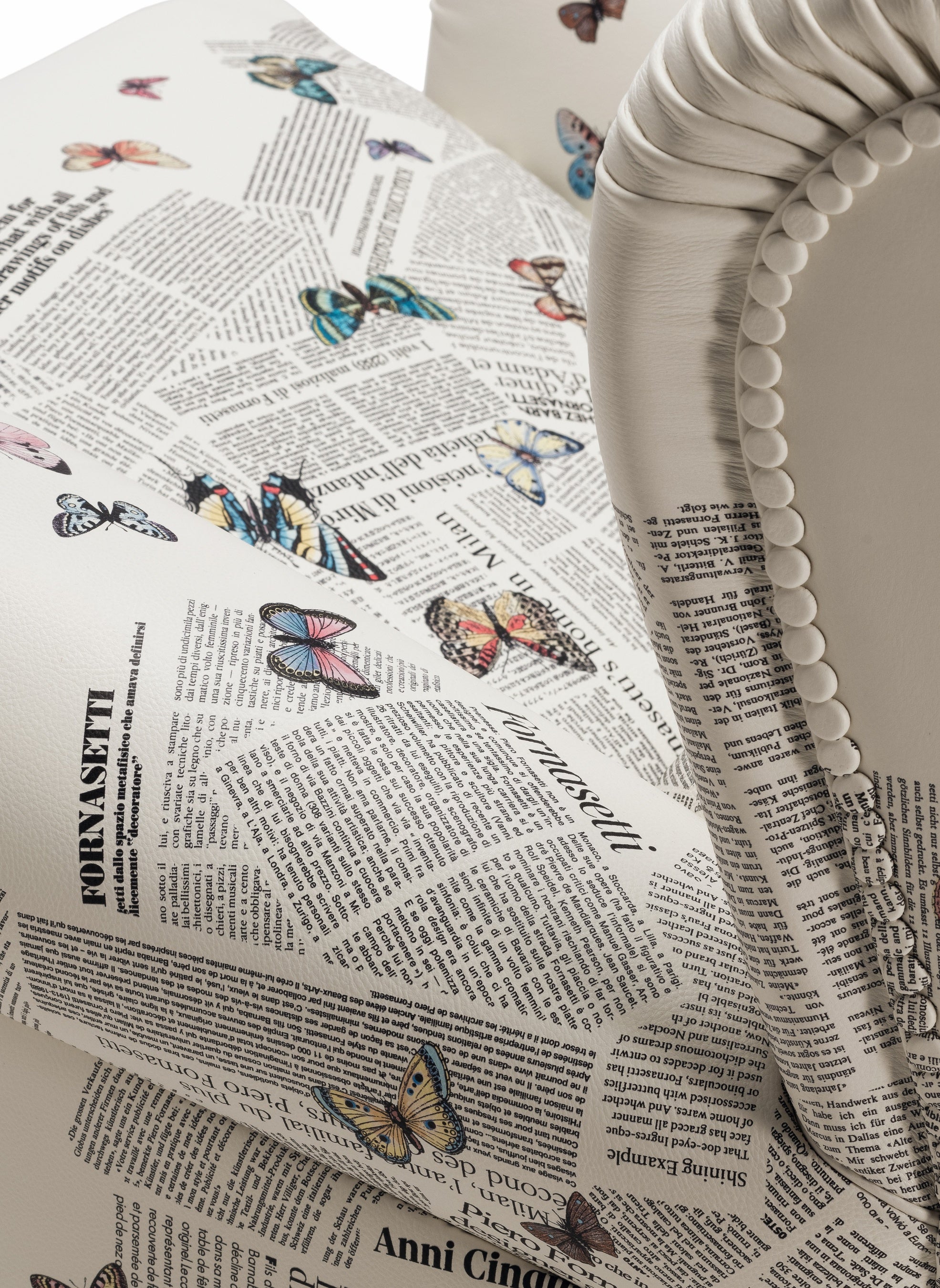 本モデルでは、フォルナセッティのモチーフ「Ultime Notizie」をプリントしたPelle Frau®レザーを採用。新聞の断片を思わせるグラフィックの中に蝶が舞う印象的なデザインが、アイコニックなアームチェアをアートピースのような存在感へと昇華しています。