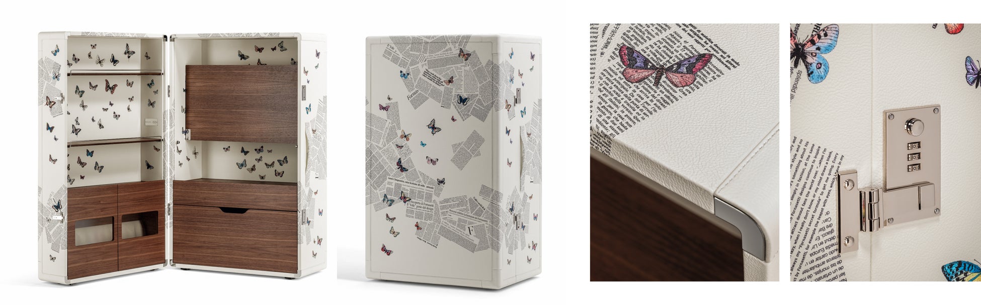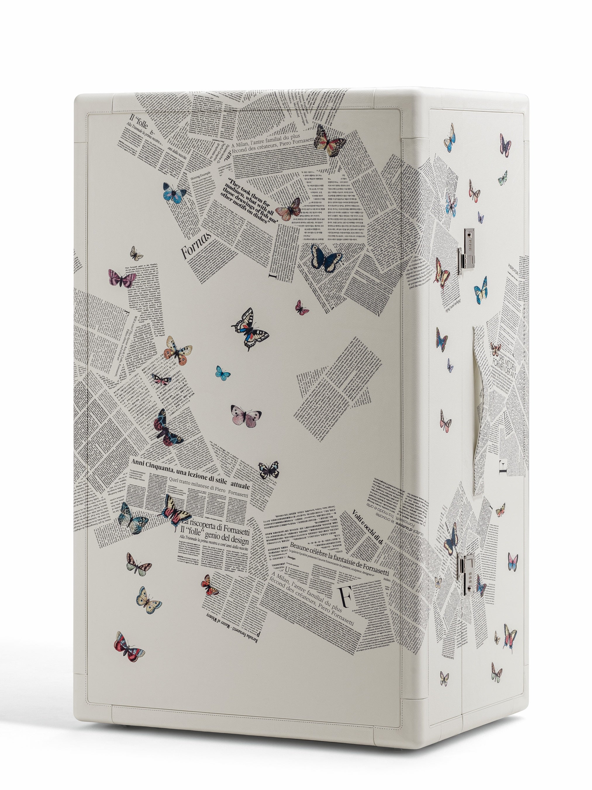 「Isidoro Ultime Notizie」は、フォルナセッティのモチーフ「Ultime Notizie」をプリントしたモデル。新聞の断片を思わせるグラフィックの中に蝶が舞う幻想的なデザインが広がり、独創的な美しさを備えたキャビネットとして、空間に特別な個性をもたらします。