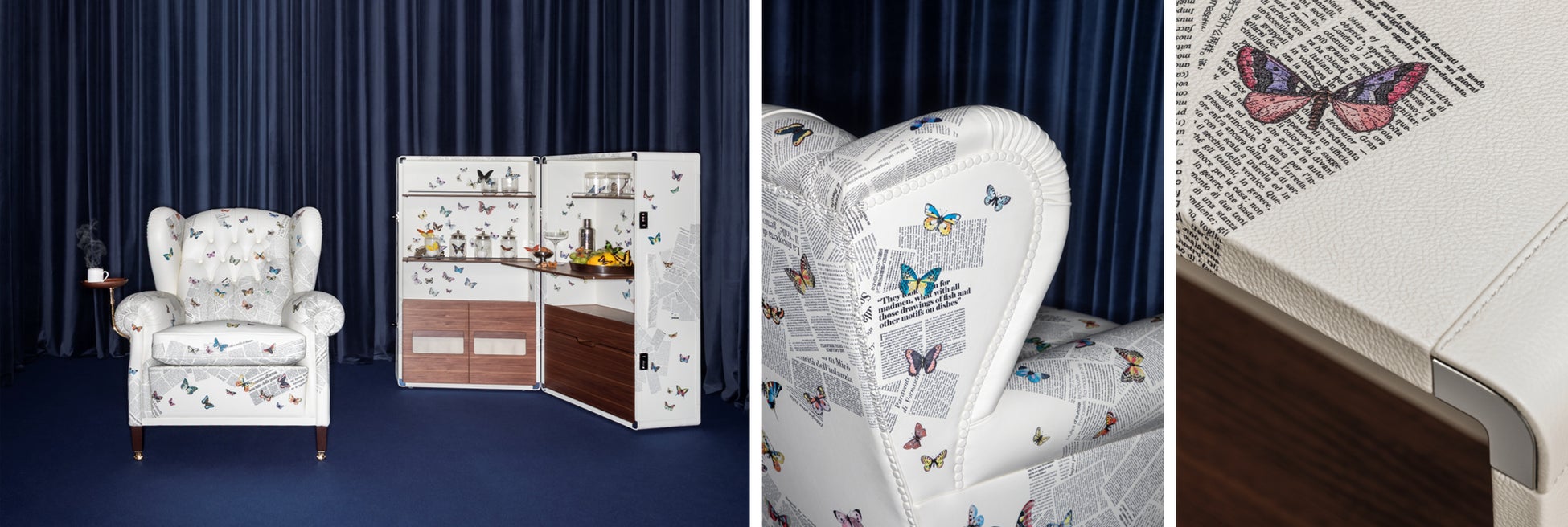本コラボレーションでは、ポルトローナ・フラウの歴史を象徴するアームチェア「1919」とトランク型ドリンクキャビネット「Isidoro(イシドロ)」という2つのアイコニックなプロダクトを、フォルナセッティを象徴するモチーフとして知られる「Ultime Notizie(ウルティメ・ノティツィエ)」で再解釈しました。