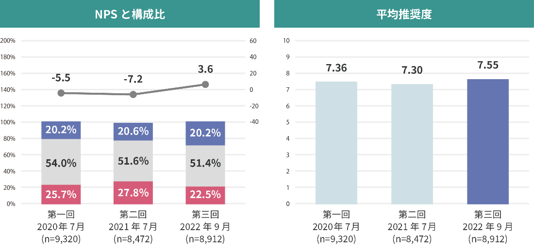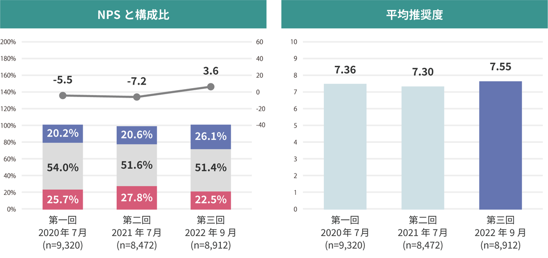 ※1 NPS(ネット・プロモーター・スコア)とは、「正味推奨者比率」と訳され、顧客ロイヤルティ(ブランドやサービスに対する信頼度・愛着度)を数値化した指標です。「親しい友人にどの程度すすめたいと思うか?」という質問から推奨度を計測し、簡単に算出できる指標でありながら、顧客満足度やその他の顧客評価指標よりも企業収益性との相関が強いことから、日本だけではなく海外(アップルやグーグル、GE等)でも導入が進んでいます。
