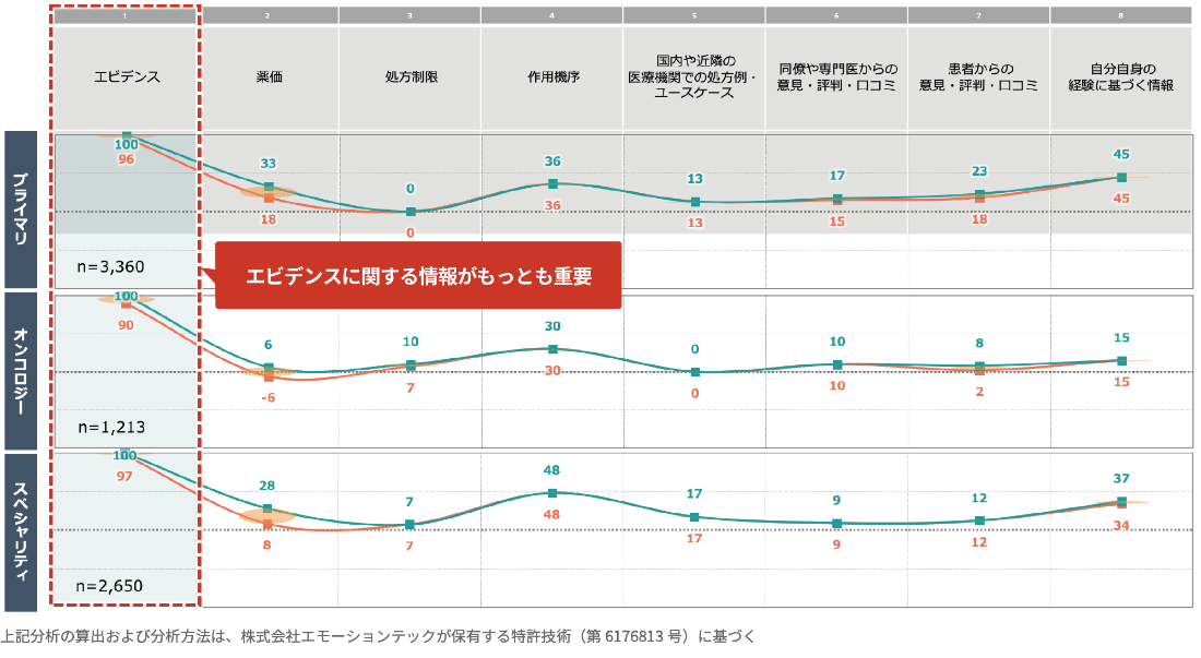 薬剤NPSを高めるには薬剤の「エビデンス」が重要な要素に。一方、薬の種類や医師の勤務形態により、注目する情報チャネルは様々