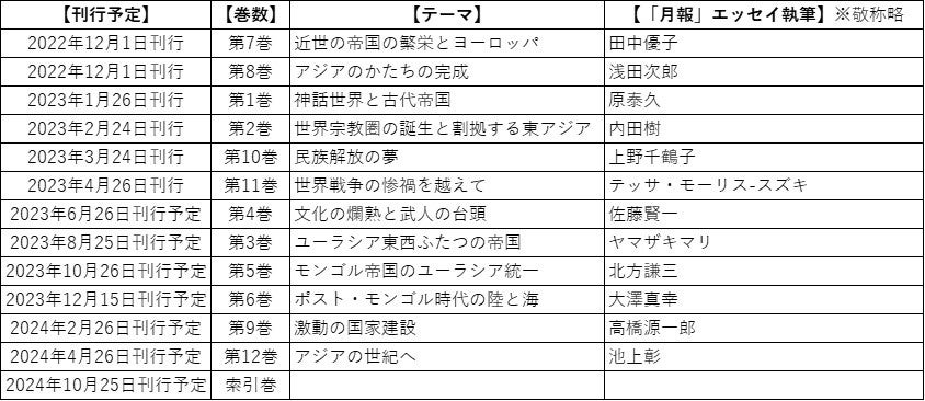 株式会社集英社創業95 周年(2021 年)の記念企画として、広大なアジア領域の歴史を人物に光を当てて完全網羅する本シリーズは、170名を超す研究者たちが、総勢10,000名にいたる登場人物たちの軌跡を追い、広大なアジア全領域が一望できる、唯一無二の構成。全集のカバーを飾るのは、『ジョジョの奇妙な冒険』シリーズを手掛ける漫画家・荒木飛呂彦氏による描き下ろし装画。現代のアジア史研究の第一人者である編集委員 10 名と、東洋史研究の伝統を継承した著者たちが、古代から 21 世紀までを展望し、歴史を動かした主人公の圧倒的個性を掘り起こす全 12 巻(+索引巻)です。
