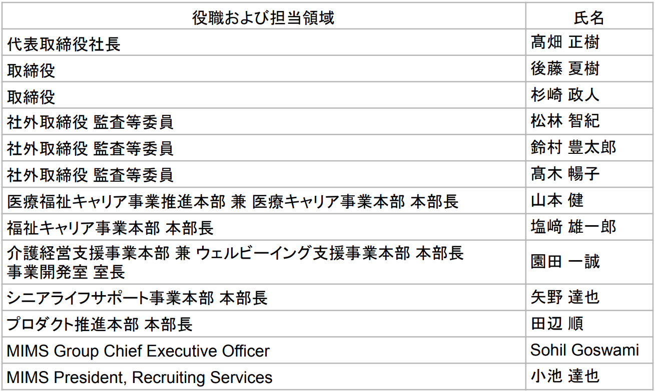 株式会社エス・エム・エス(本社:東京都港区、代表取締役社長:髙畑正樹、東証プライム、以下「当社」)は、第24期(2026年度)の経営体制についてお知らせします。当社は2003年に創業し、「高齢社会に適した情報インフラを構築することで人々の生活の質を向上し、社会に貢献し続ける」ことをミッションに掲げ、さまざまな事業を開発、運営しています。2026年1月1日付で創業者から3代目の代表取締役社長となる髙畑正樹が就任しました。第24期も役員ならびに各本部長のもと、さらなる事業成長を進めてまいります。