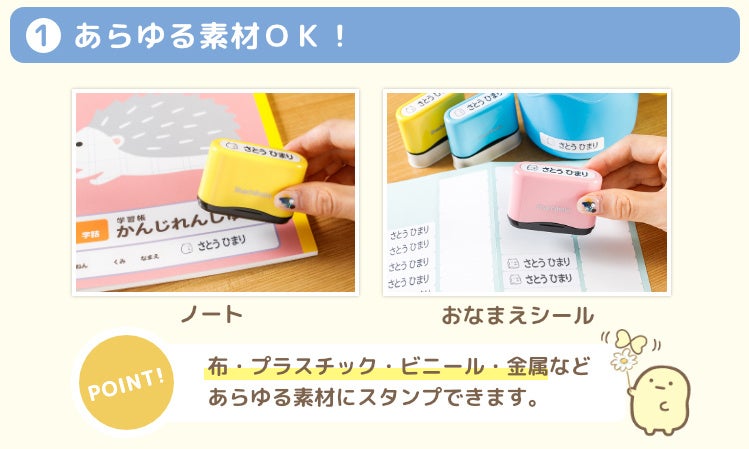 お名前のすみっこにいるキャラクターはどれも愛らしいものばかり。ポン!と自分のもちものに押すだけで、いつでもどこでも大好きなすみっコと一緒にいられる「すみっコぐらし もちものスタンプロング」。はんこというと事務的でお堅いイメージがありますが、 わたしたちはこれからも好きな人にはたまらないユニークな企画をつうじて、 ハンコに愛着を持つ人を増やしてまいります。
