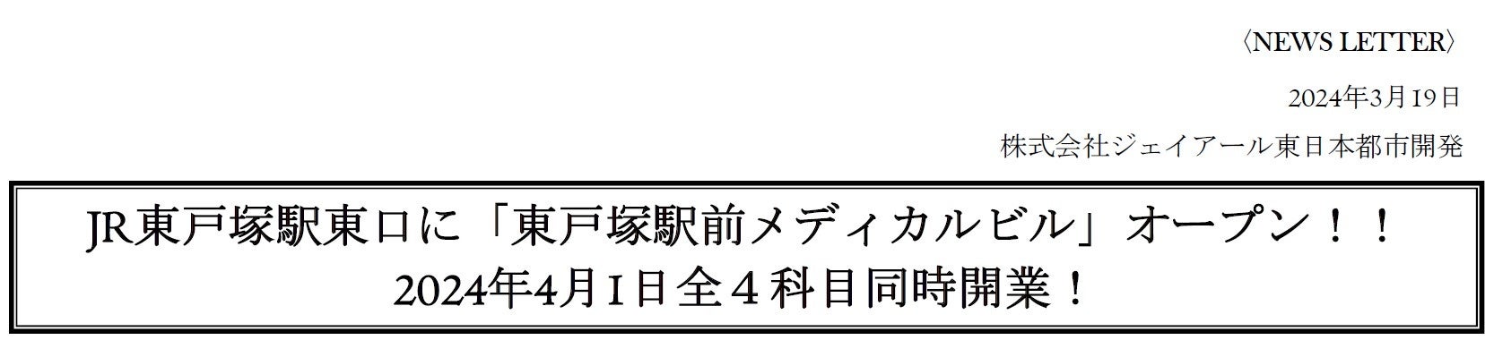 ㈱ジェイアール東日本都市開発(本社 東京都渋谷区/代表取締役社長 根本英紀)により、JR東戸塚駅東口に医療クリニックビル「東戸塚駅前メディカルビル」が2024年4月1日(月)にオープンします。東戸塚駅に隣接した利便性の高い場所で1階に調剤薬局、2階から6階にはクリニック(婦人科・内科・眼科・耳鼻咽喉科の4科目)を誘致しました。利用者さま一人ひとりの健康生活に一丸となって寄り添う、そんな通いやすい施設となれるよう経験豊富な先生方と運営してまいります。