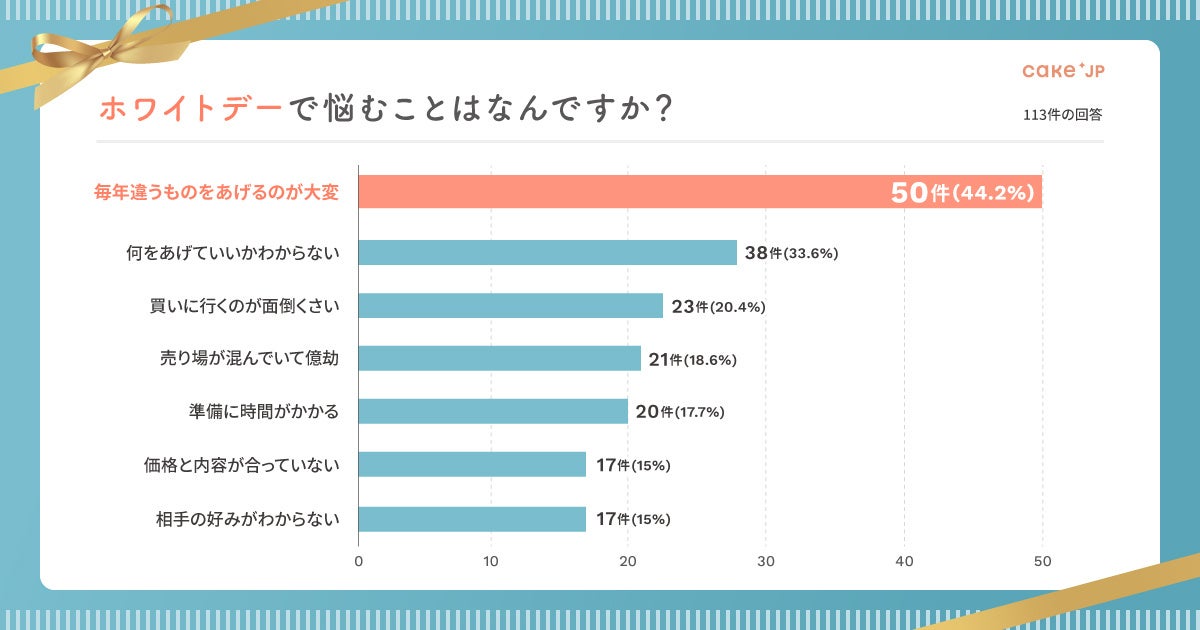 ■ホワイトデーで悩むことは「毎年違うものをあげるのが大変」と答えた方が44%