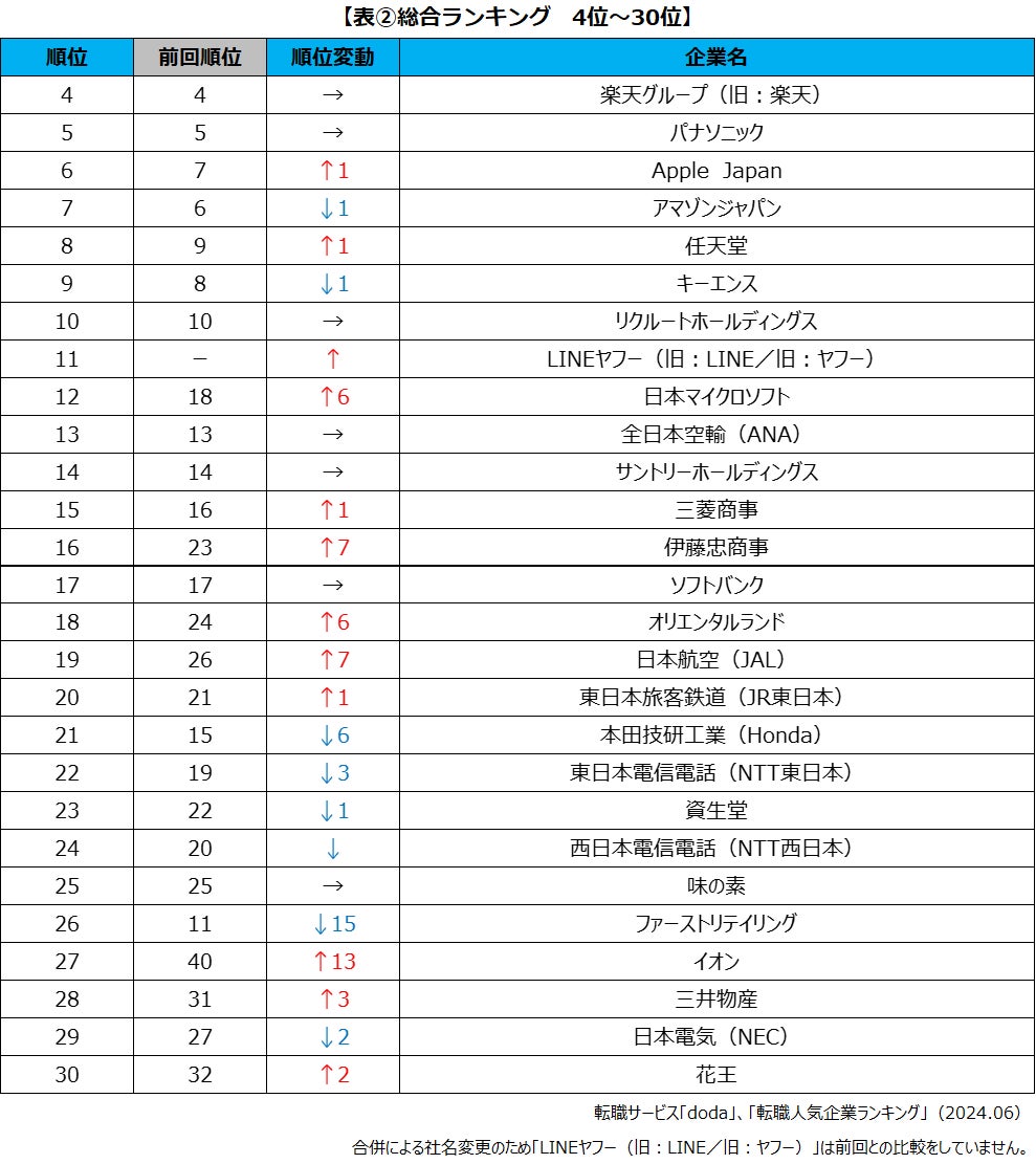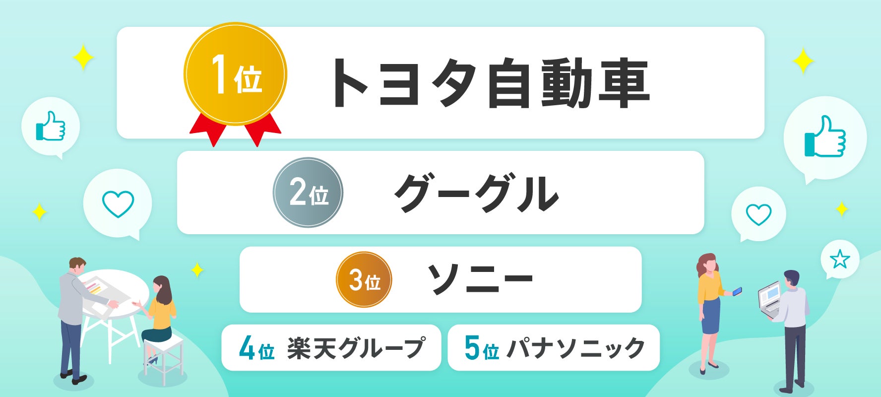 3位「ソニー」も安定した人気をキープしています。4位の「楽天グループ(旧:楽天)」と5位の「パナソニック」も前回から順位の変動はなく、6位から10位については、順位の変動はあったものの、企業の顔ぶれには変化がありませんでした。