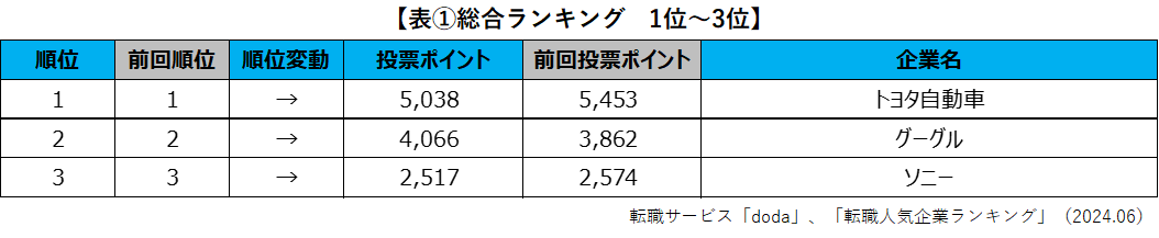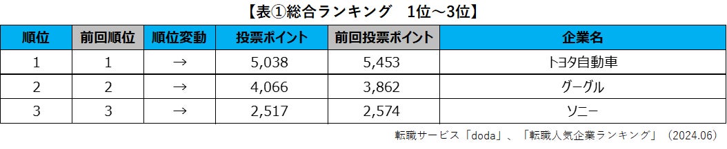 転職サービス「doda」、「転職人気企業ランキング2024」を発表 トヨタ自動車、グーグル、ソニーが5年連続TOP3