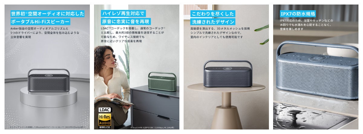 Soundcoreのスピーカーのフラッグシップモデルとして登場する本製品は、ポータブルHi-Fiスピーカーとして世界で初めて空間オーディオに対応(※2)し、部屋全体を包み込むような立体音響と高級感のある製品デザインが特徴。Anker独自の空間オーディオアルゴリズムによってリアルタイムで音楽や音声を解析し、左右にそれぞれ1つずつ配置されたウーファーとツイーターに加え、上部のスカイスピーカーにそれぞれ最適な音を分配することで立体音響を実現し、部屋全体を音楽が包みこむような空間オーディオをお楽しみいただけます。さらにLDAC™コーデックに対応しているため、通常のコーデックと比較すると約3倍(※3)の情報量を送信することができ、ワイヤレス接続でも原音に近いクリアな音質で再生可能です。また、50Hz-40kHzの幅広い周波数帯に対応することで、低音から高音まであらゆる音域で豊かで繊細な音を実現します。