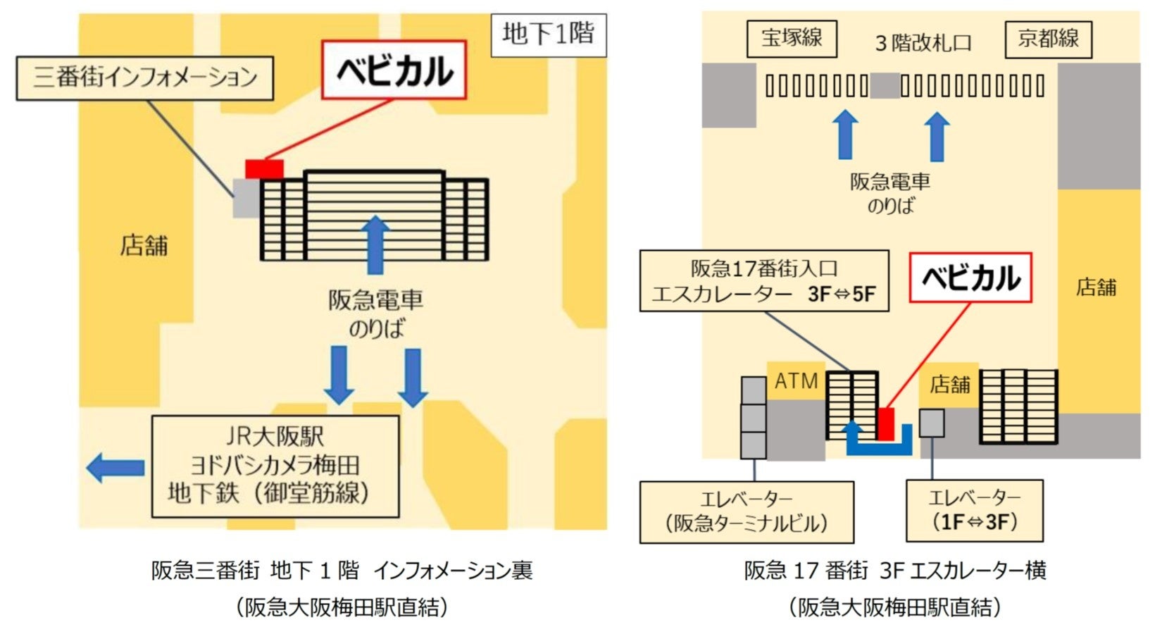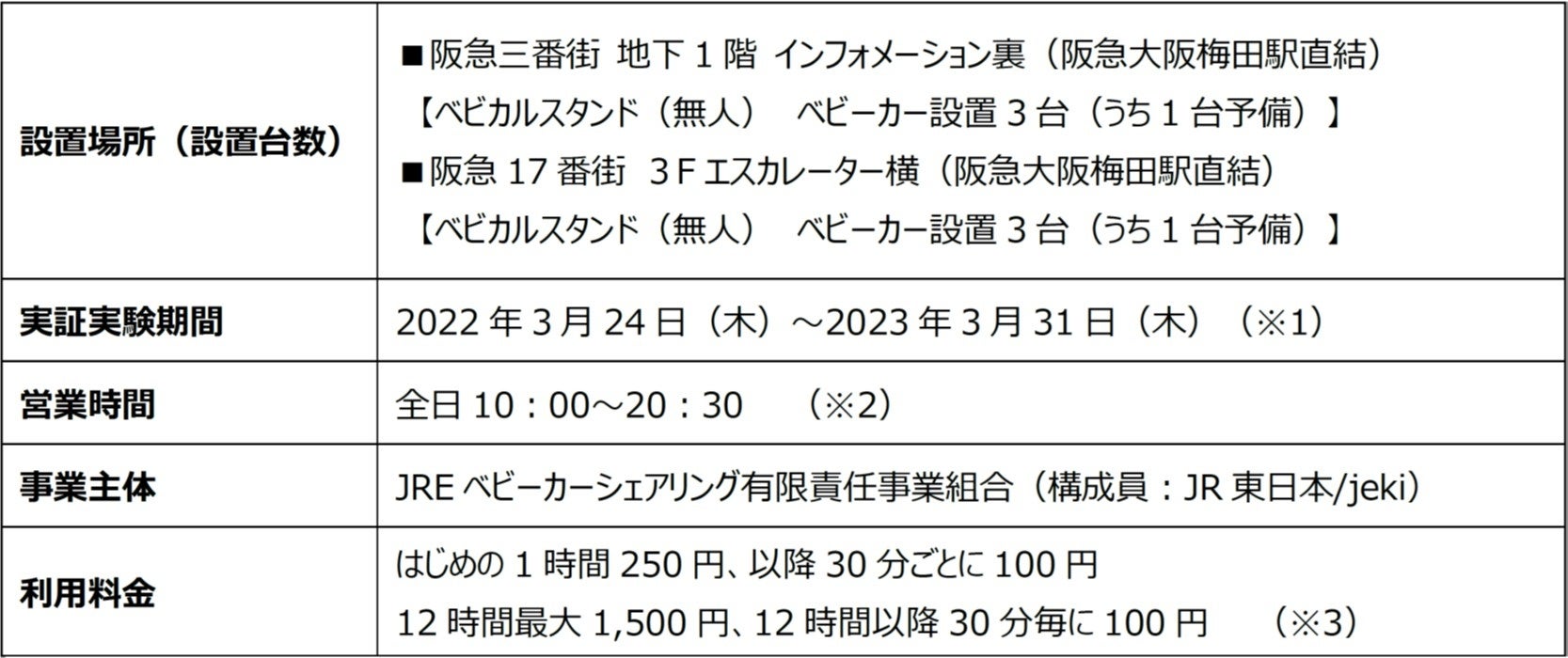 | 〇東日本旅客鉄道株式会社(本社:東京都渋谷区、代表取締役社長:深澤 祐二/以下「JR東日本」)と株式会社ジェイアール東日本企画(本社:東京都渋谷区/代表取締役社長:赤石 良治/以下「jeki」)が提供するベビーカーレンタルサービス「ベビカル」が、阪急阪神不動産株式会社(本社:大阪市北区、代表取締役社長:諸冨 隆一/以下「阪急阪神不動産」)とともに、JR東日本管外のエリアへ初めて拠点を展開します。 〇今回の実証実験では、「阪急三番街」、「阪急17番街」(阪急大阪梅田駅直結)の2カ所にてサービスを提供し、関西エリアにおける子育て世代の気軽なお出かけをサポートします。 〇阪急阪神不動産では、大阪梅田および阪急阪神沿線の商業施設において、デジタル技術を活用したお客さまサービスの向上や、安心・安全な施設運営に取り組んでおり、今回のサービスの主旨に賛同し、「ベビカル」の設置を進めるものです。今後もJR東日本、jekiとともに、設置エリアの拡大を図り、気軽にお子さまとお出かけできる社会の創造を目指して参ります。 |
