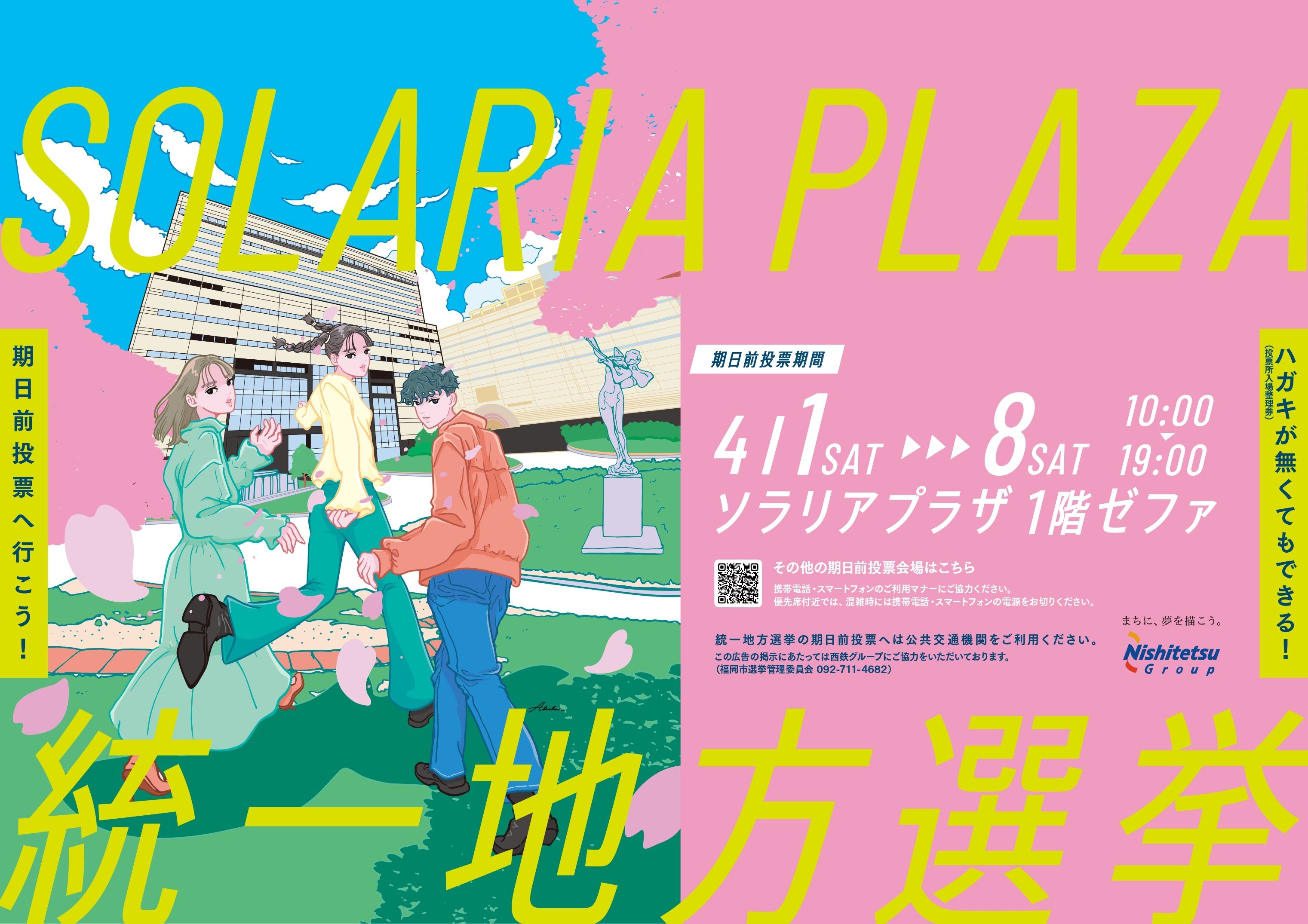 今回ソラリアプラザに設置される期日前投票所は、福岡市内のどの行政区にお住まいの方でも期日前投票を行うことができます。この機会にぜひ、ソラリアプラザにお越しいただき、期日前投票をお済ませのうえ、館内でのお食事・カフェやショッピングをお楽しみください。