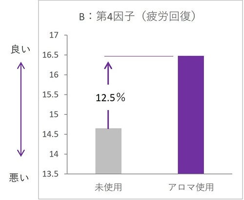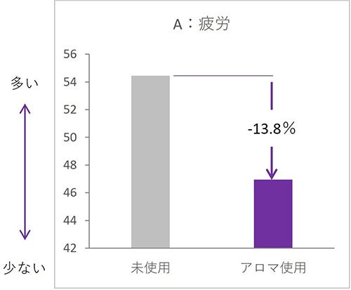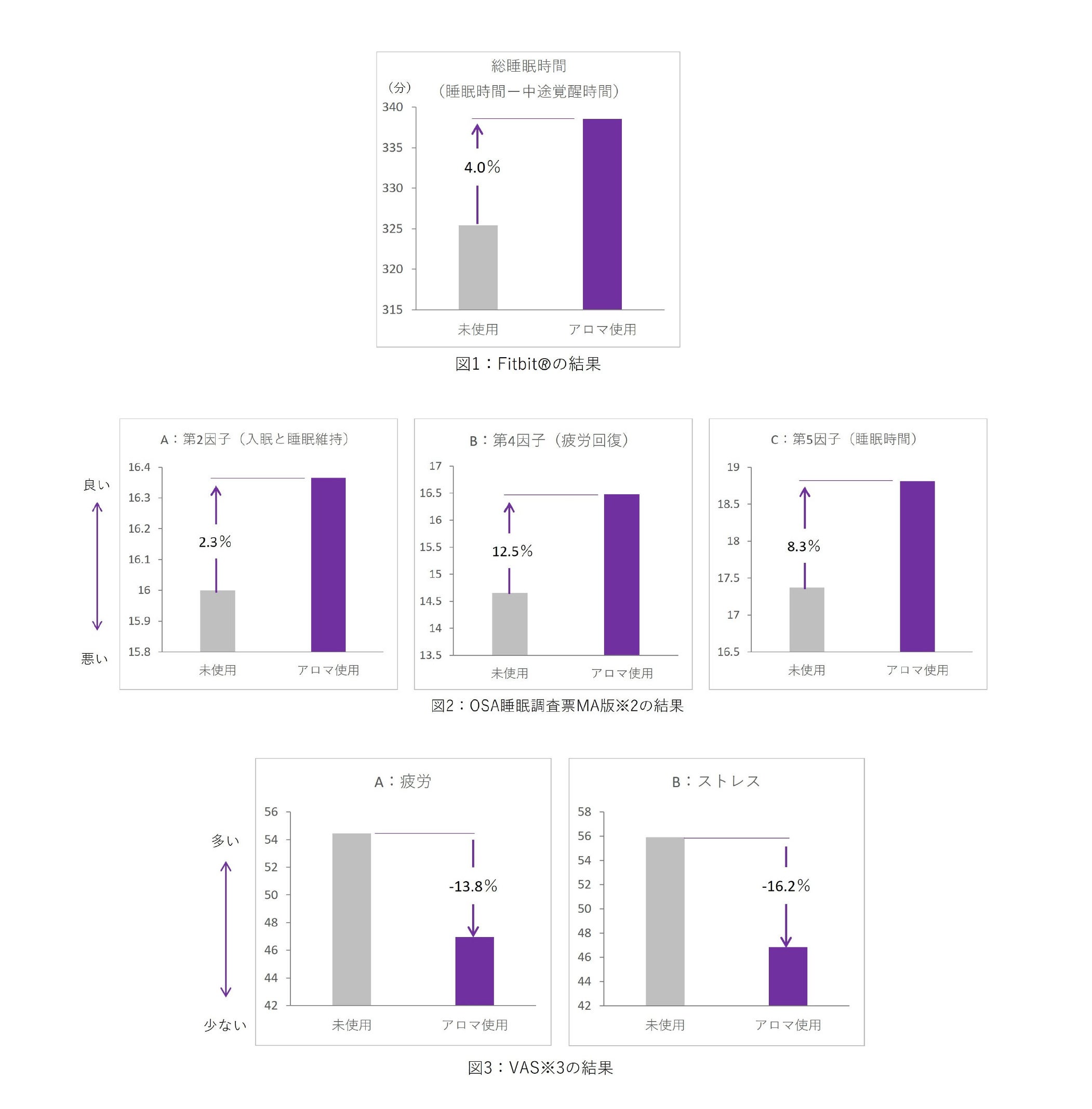 以上の研究結果から、アロマにより睡眠の質や時間が改善され、それにより心身の疲労、ストレスを緩和する効果が期待できることが予想されます。