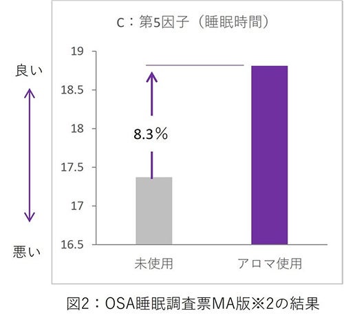アロマを睡眠時に使用することで、Fitbit®で計測した睡眠時間が増加しました(図1)。また、OSA睡眠調査票