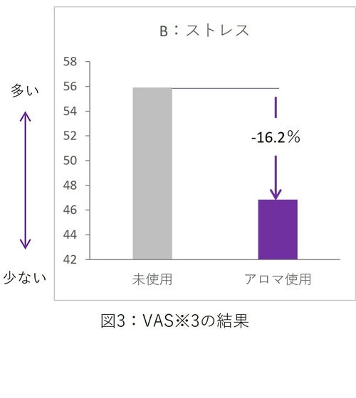 MA版※2の結果では、第2因子「入眠と睡眠維持」※2、第4因子「疲労回復」※2、第5因子「睡眠時間」※2のスコアが増加し、睡眠の質や睡眠による疲労の回復が見られました(図2)。さらに試験参加者によるVAS※3の回答では、アロマの使用によりストレスと疲労感の軽減がみられました(図3)。また、今回の研究において芳香成分が寝室に飛沫している状態で就寝すること、また寝具に芳香成分が付着し皮膚へ直接接触することへの安全性も同時に確認されました。