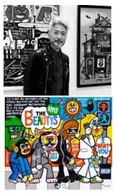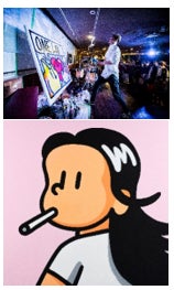 POPな色合いとシンプルで力強い線から産み出される暖かみのある作品はストリートを飛び越え幅広い支持を得ている。