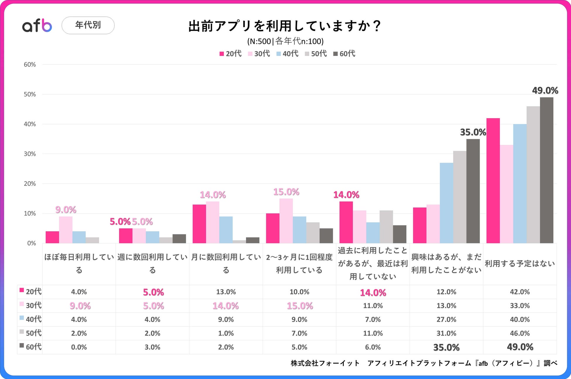 アフィリエイトプラットフォーム「afb(アフィビー)」< https://www.afi-b.com/ >の開発運用をおこなう株式会社フォーイットは、全国の20代~60代までの男女500人を対象に暮らしに関するアンケートを実施し、年代別等の特徴についてまとめました。